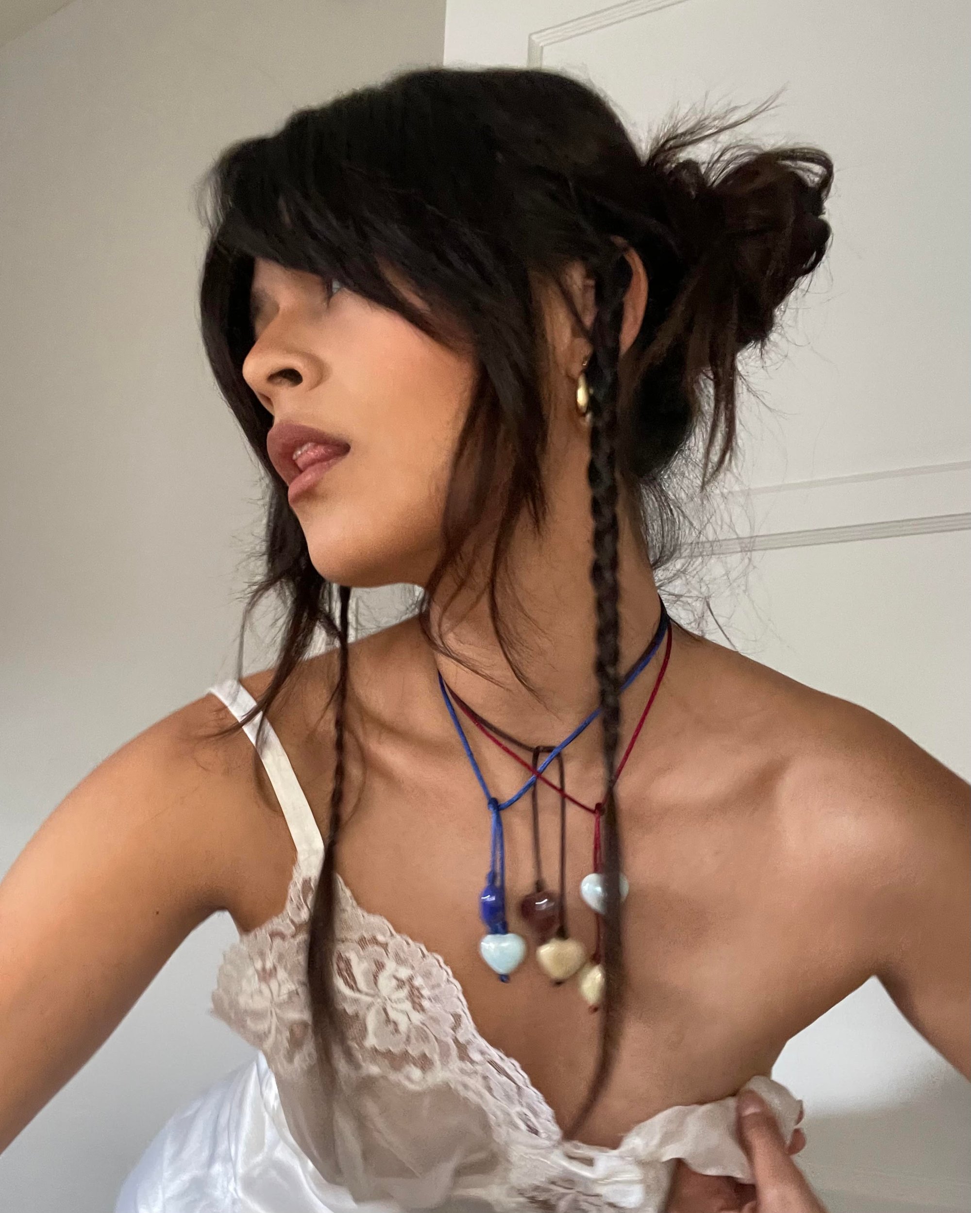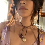 It measures 20 inches and ties around the neck, letting the hearts fall softly over the chest.